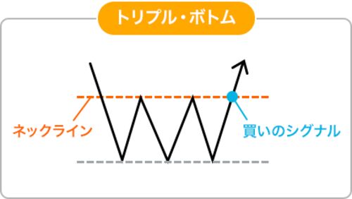 トリプルボトムは転換型のチャートパターンであり、下降トレンドの終わりを意味します。3つの安値がほぼ同じ価格で推移するのが特徴。 またネックラインも重要で、3つの安値がほぼ同じ価格で推移してもネックラインを上回らなければ、トリプルボトムの完成…